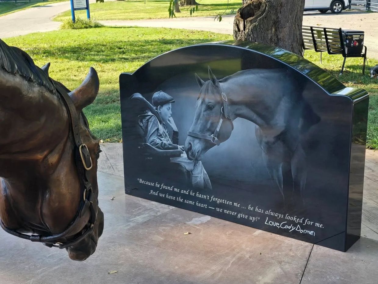 "The Bond: Two Hearts - One Spirit" is a Monument by artist Jocelyn Russell that celebrates this very special connection between Cody Dorman and this very special horse, Cody's Wish. When Cody’s Wish placed his head into the lap of Cody Dorman - not once, but every time they met - it lit a fire in both of their hearts.. With this monument, we want everyone to be inspired and to experience that same feeling and connection.