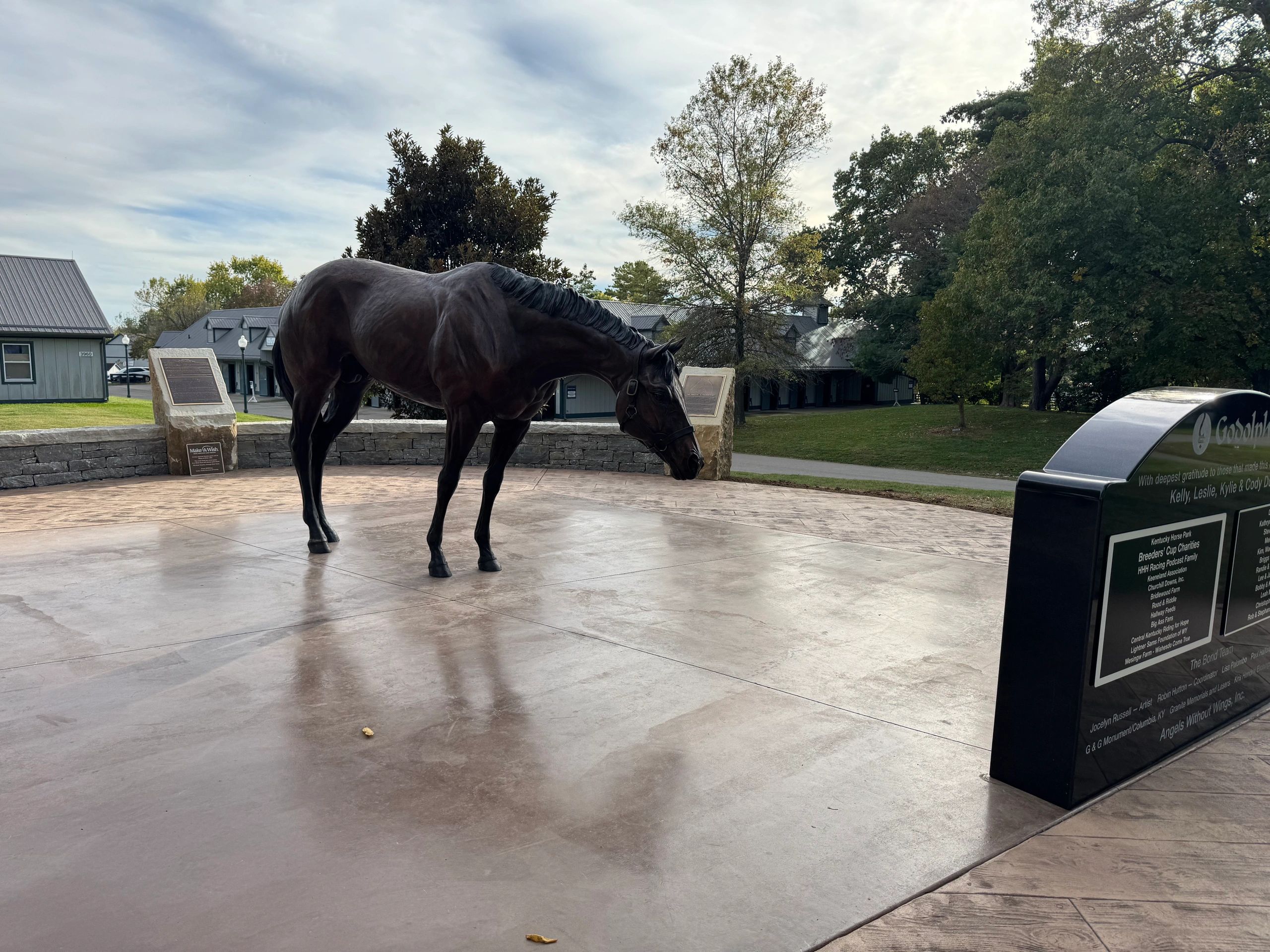 The specific site is alongside Champion Drive and up from the Big Barn and Big Barn Road, in a beautiful grassy area across the street from the Event Stabling barns and paddock near the Hall of Champions. The trolley goes by several times a day and this monument is not only part of the tour, but a destination site at the Park.